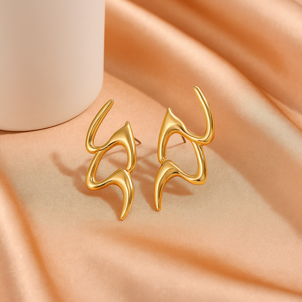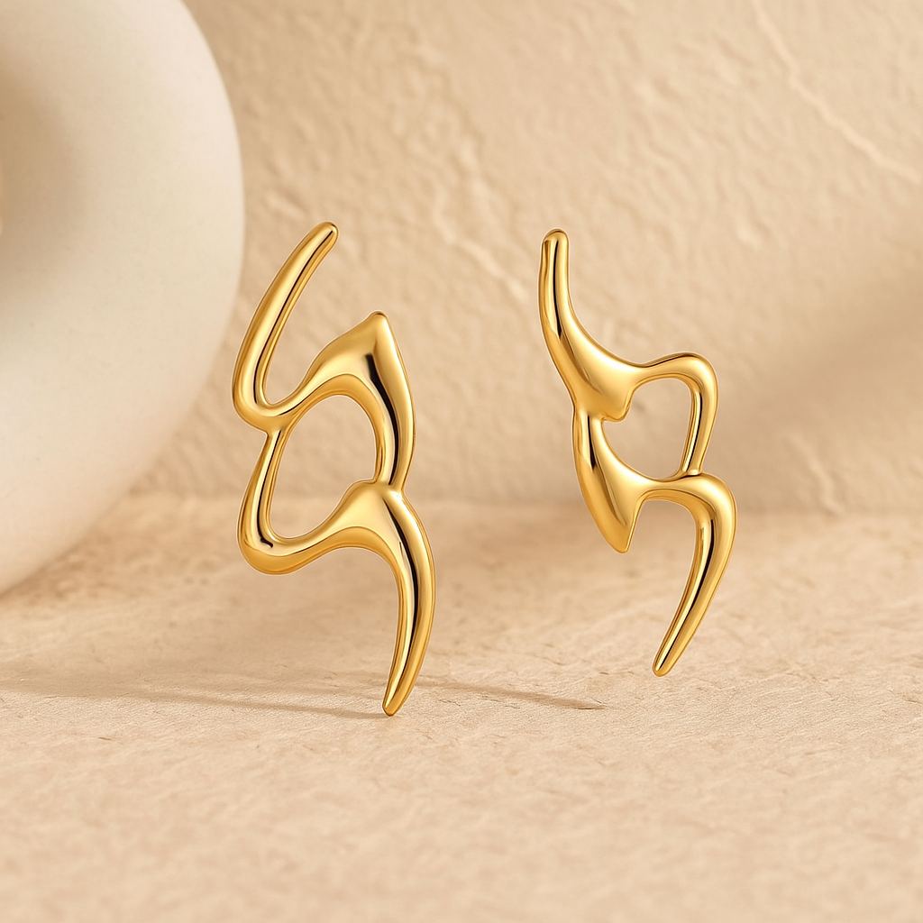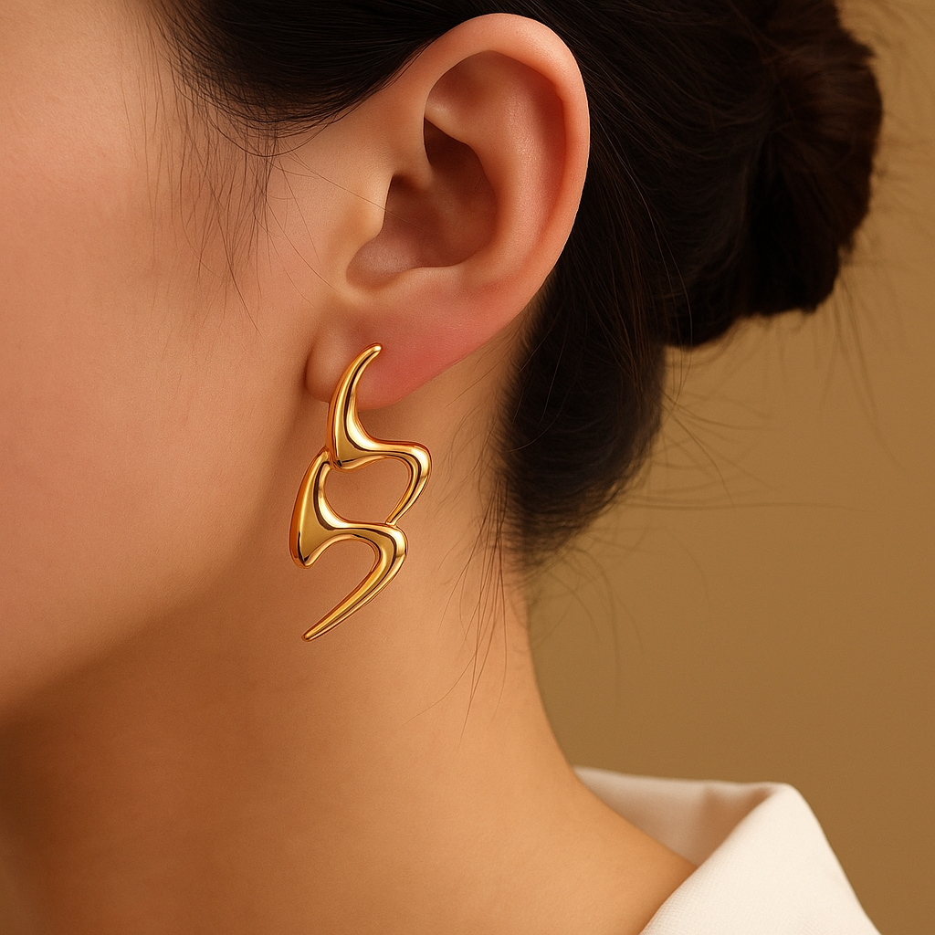 Bold and sculptural, the Auric Ember Drops are a modern take on abstract elegance. Crafted in high-polish gold tones, their fluid, flame-like curves evoke movement and fierce femininity. Lightweight yet impactful, these earrings make a powerful statement without saying a word.