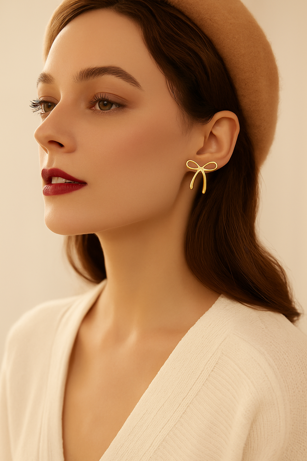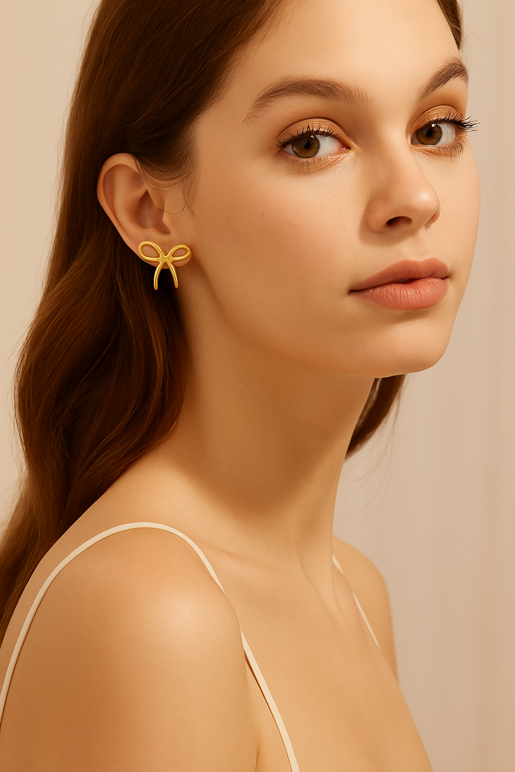 The Golden Bow Whisper earrings feature a delicate ribbon-inspired design, expertly crafted in polished gold for a playful yet sophisticated look. Their lightweight structure and timeless bow shape make them the perfect blend of charm and elegance, adding a subtle statement to any outfit.