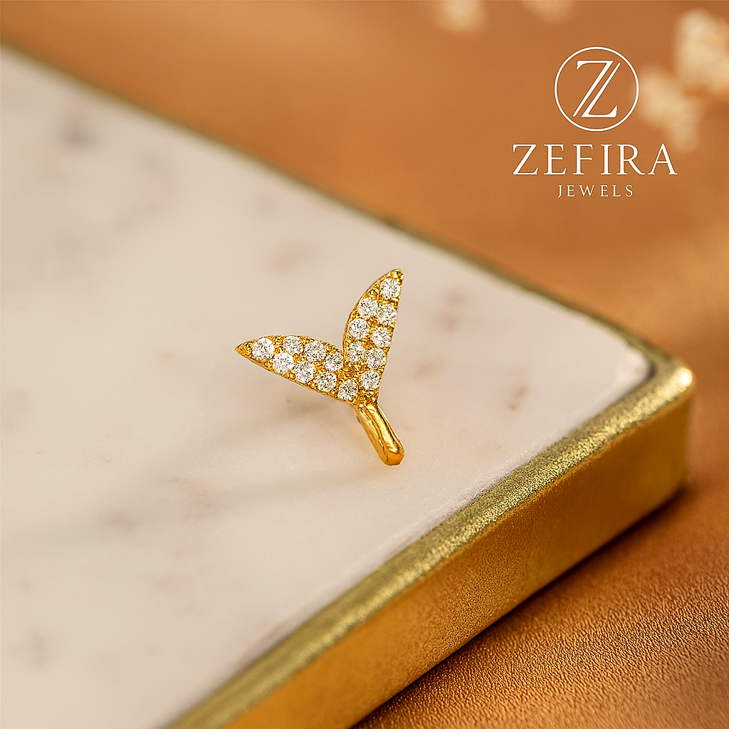 Dive into elegance with the Ocean Glimmer Nose Cuff, inspired by the graceful tail of a mermaid. Crafted in gold and adorned with delicate white stones, this piece adds a whimsical yet luxurious charm to your look. The sleek, minimal design ensures it catches the light — and attention — from every angle.