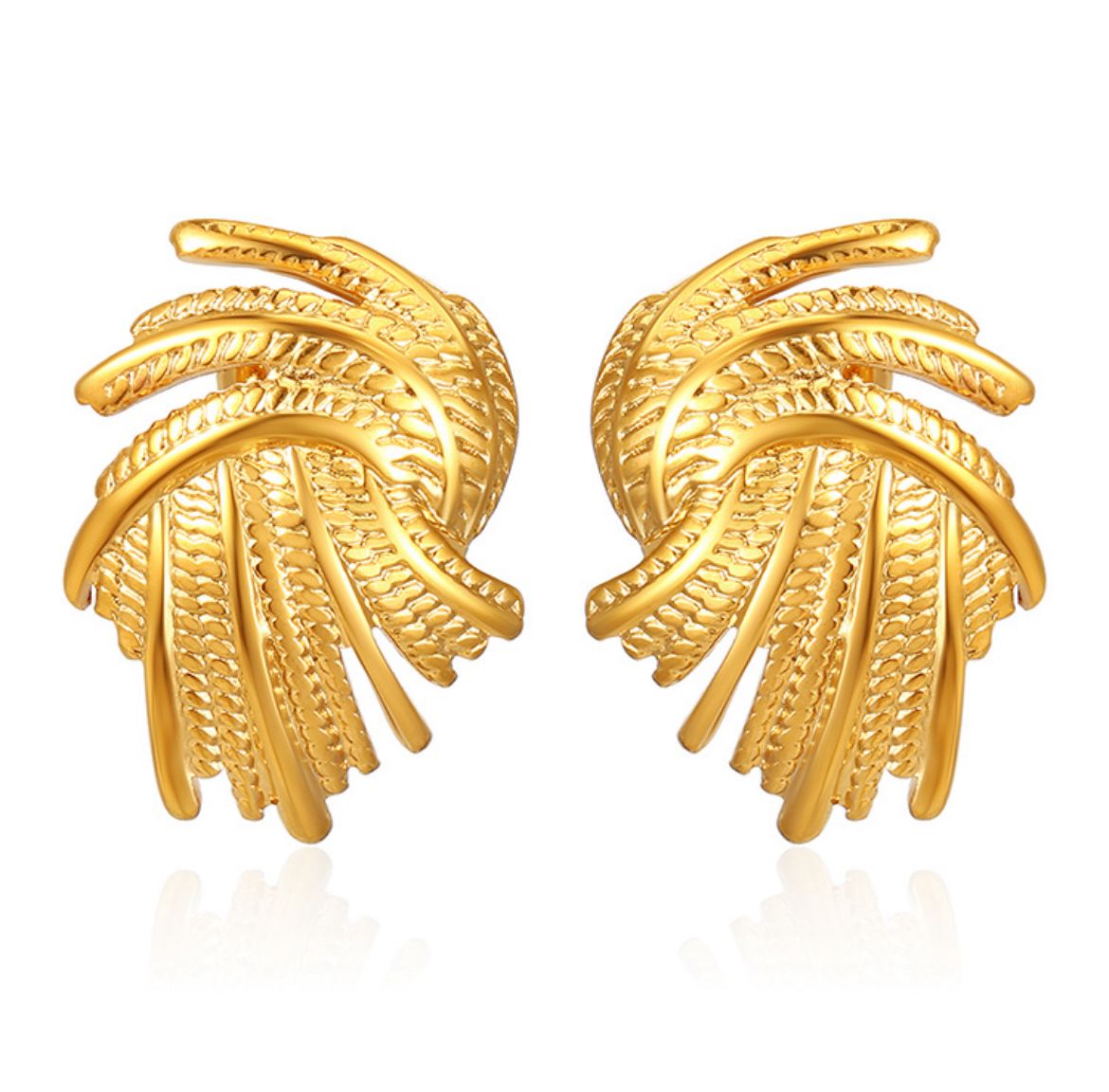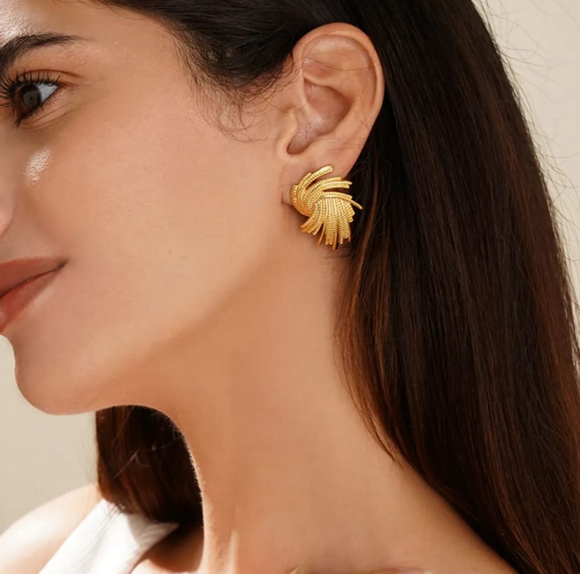 These 18K gold plated earrings feature a swirling, fan-like silhouette that radiates movement and light. With their layered, textured strands and high-polish finish, they evoke a sense of vintage glamour reimagined through a modern lens. Bold yet refined, they offer the perfect balance of elegance and edge.